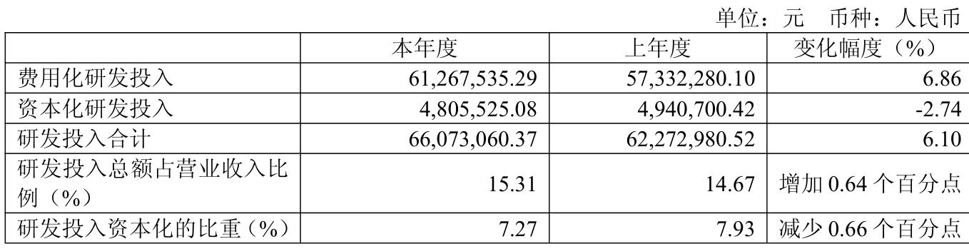 2025年全年,公司研发投入金额为6607.31万元,同比增长6.1%;研发投入占营业收入比例为15.31%,相比上年同期上升0.64个百分点。此外,公司全年研发投入资本化率为7.27%。