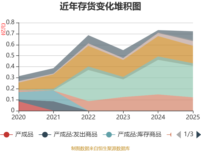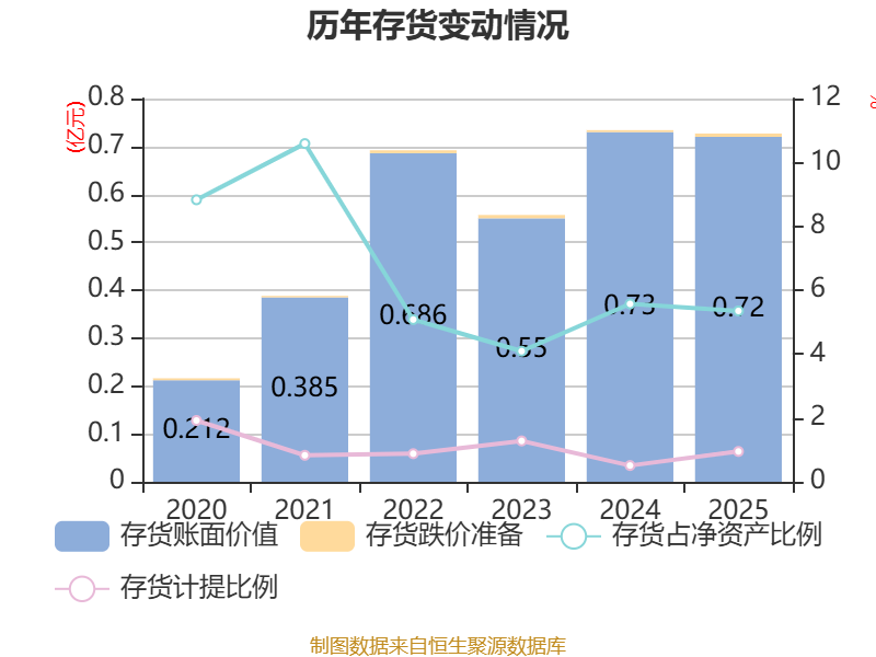 从存货变动来看,截至2025年末,公司存货账面价值为7198.89万元,占净资产的5.35%,较上年末减少106.04万元。其中,存货跌价准备为69.12万元,计提比例为0.95%。