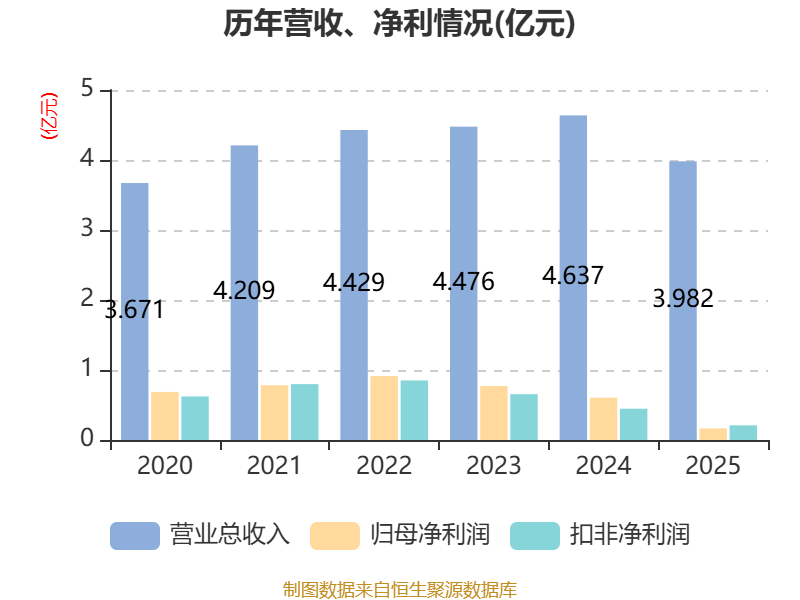 中证智能财讯科源制药(301281)4月16日披露2025年年度报告。2025年,公司实现营业总收入3.98亿元,同比下降14.12%;归母净利润1655.3万元,同比下降72.62%;扣非净利润2097.38万元,同比下降53.08%;经营活动产生的现金流量净额为4346.91万元,上年同期为-6051.58万元;报告期内,科源制药基本每股收益为0.15元,加权平均净资产收益率为1.22%。公司2025年度分配预案为:拟向全体股东每10股派现0.5元(含税)。