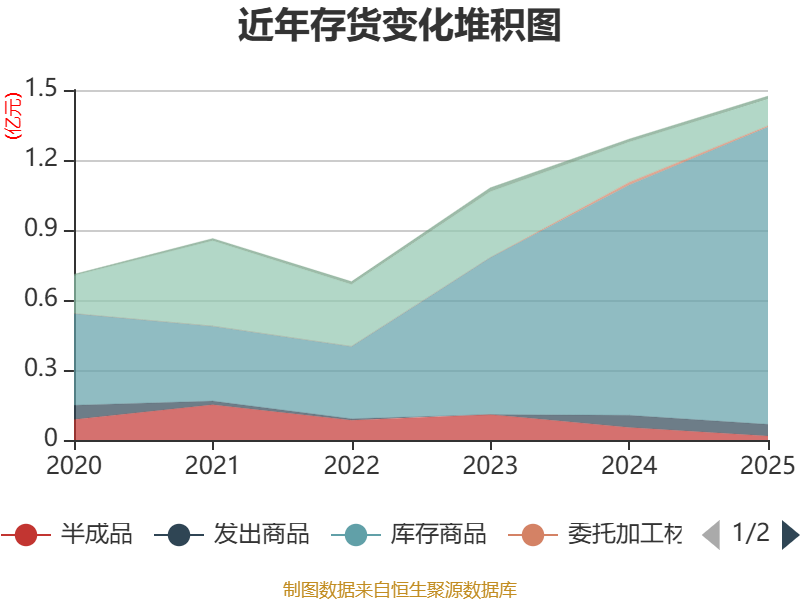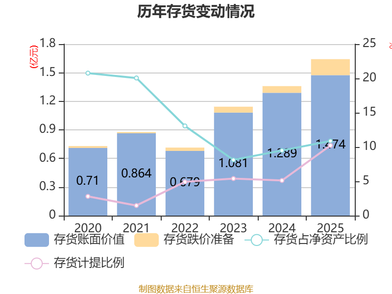 从存货变动来看,截至2025年末,公司存货账面价值为1.47亿元,占净资产的10.88%,较上年末增加1850.22万元。其中,存货跌价准备为1680.05万元,计提比例为10.23%。