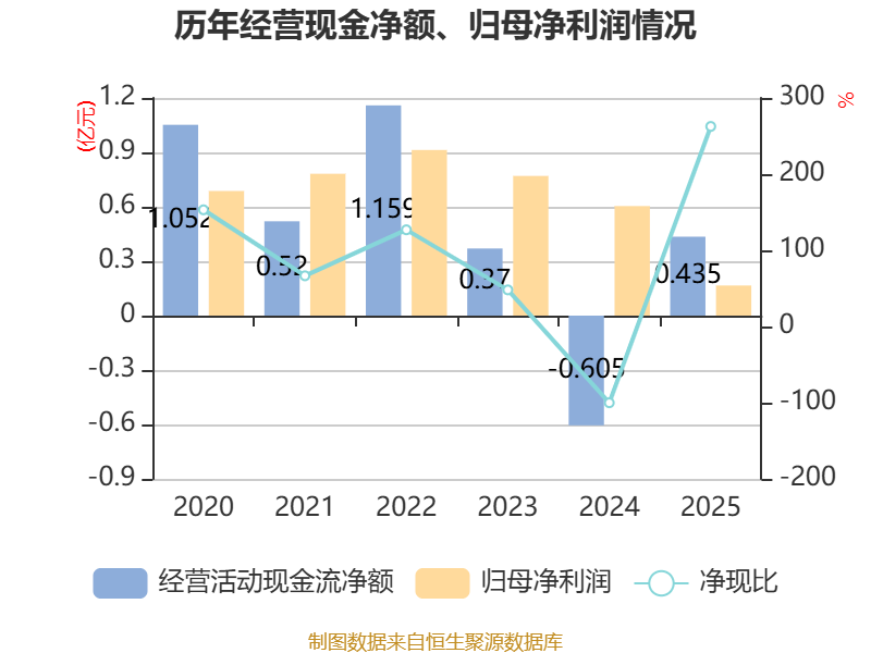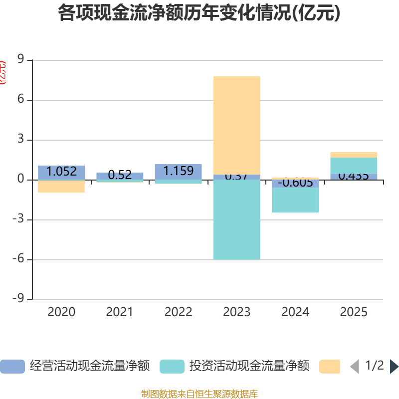 截至2025年,公司经营活动现金流净额为4346.91万元,同比增加1.04亿元;筹资活动现金流净额4178.29万元,同比增加2671.4万元;投资活动现金流净额1.21亿元,上年同期为-1.88亿元。