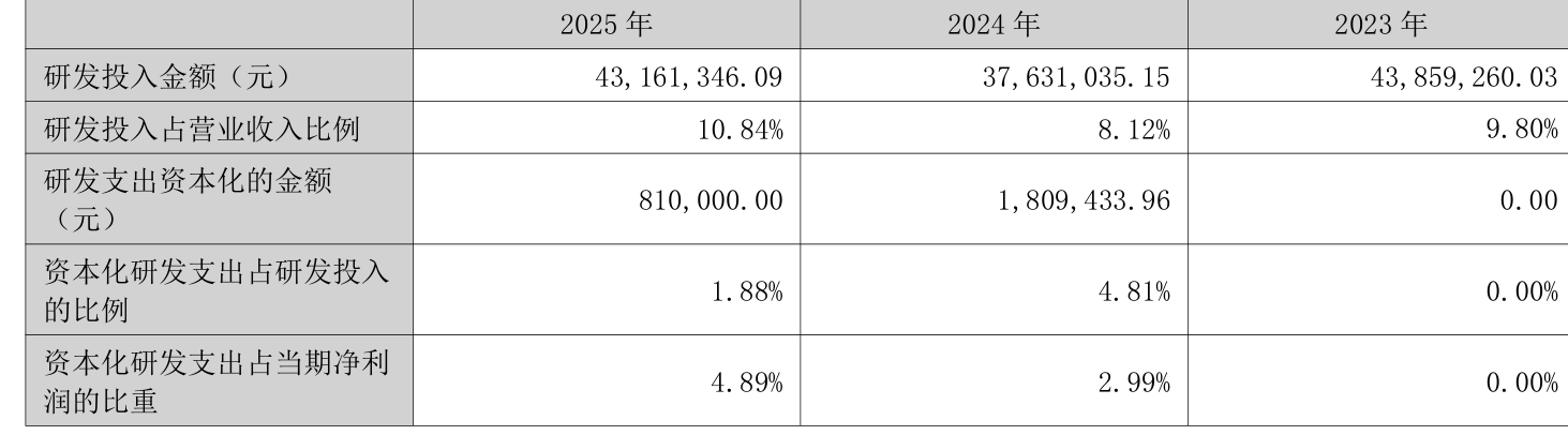 2025年全年,公司研发投入金额为4316.13万元,同比增长14.7%;研发投入占营业收入比例为10.84%,相比上年同期上升2.72个百分点。此外,公司全年研发投入资本化率为1.88%。
